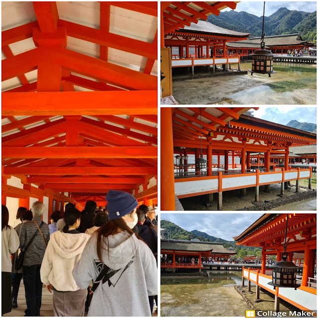 A caminhada pela ilha se inicia numa área cheia de lojas de souvenires, comidas, bares que vendem o famoso drink da ilha "Hiroshima Lemon Gin", até que chegamos em frente a um dos templos mais lindos que vi no Japão, o templo xintoísta Itsuku-shima Jinja. Resolvi antes de enfrentar os templos tomar um creme de marisco para não sentir fome enquanto andava pelos templos. Entrei numa fila e uma simpática velhinha me vendeu sua especialidade, creme de marisco.